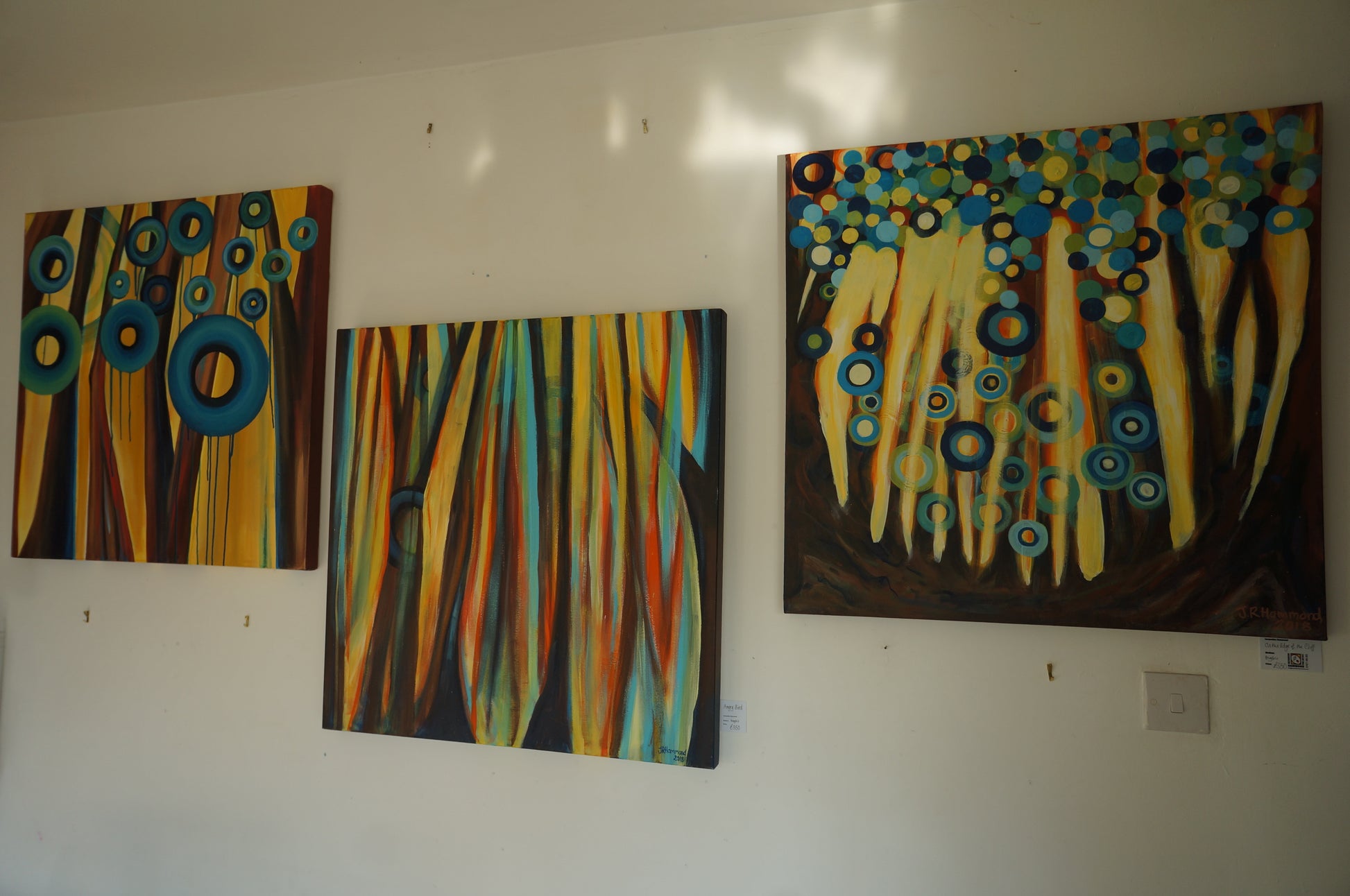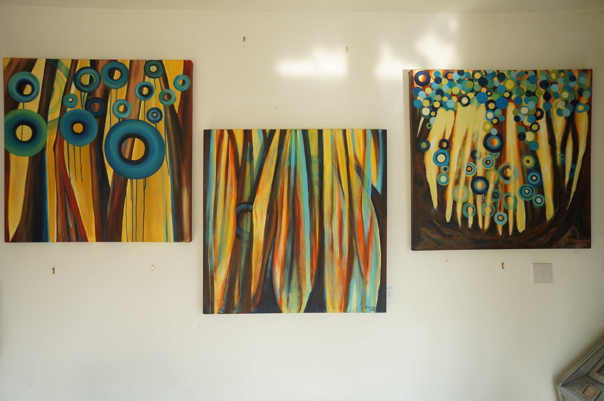 Minimal and bold, striking colours on a large scale canvas. Acrylic painting on canvas. Abstract expressionism style piece depicting an abstracted woodland scene. The trunks of trees and branches close up, reduced to striped contrast with the effect of bright warm light bursting through the trees.