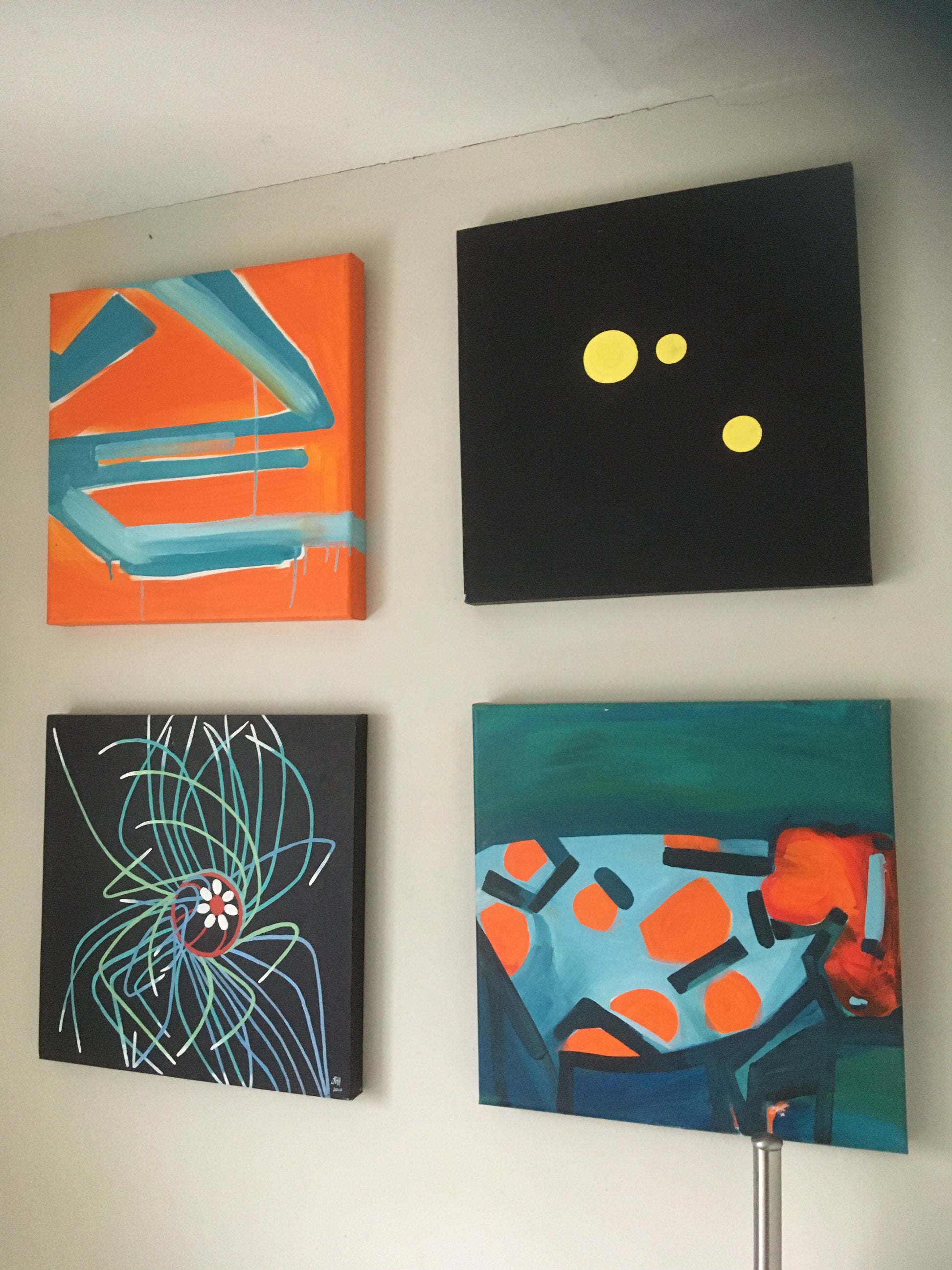 Experimental piece painted alongside ‘Englishmen’ as in the English idiom ‘Only mad dogs and Englishmen go out in the midday sun.’ Mad cow or dog the choice is yours! The painting has a bright orange background with a layer of blue toned brush strokes, horizontal, angular, abstracted and simplistic in form. Spontaneity leaps from the canvas. Great piece of art to give a simplistic modern touch and splash of colour to brighten any space.