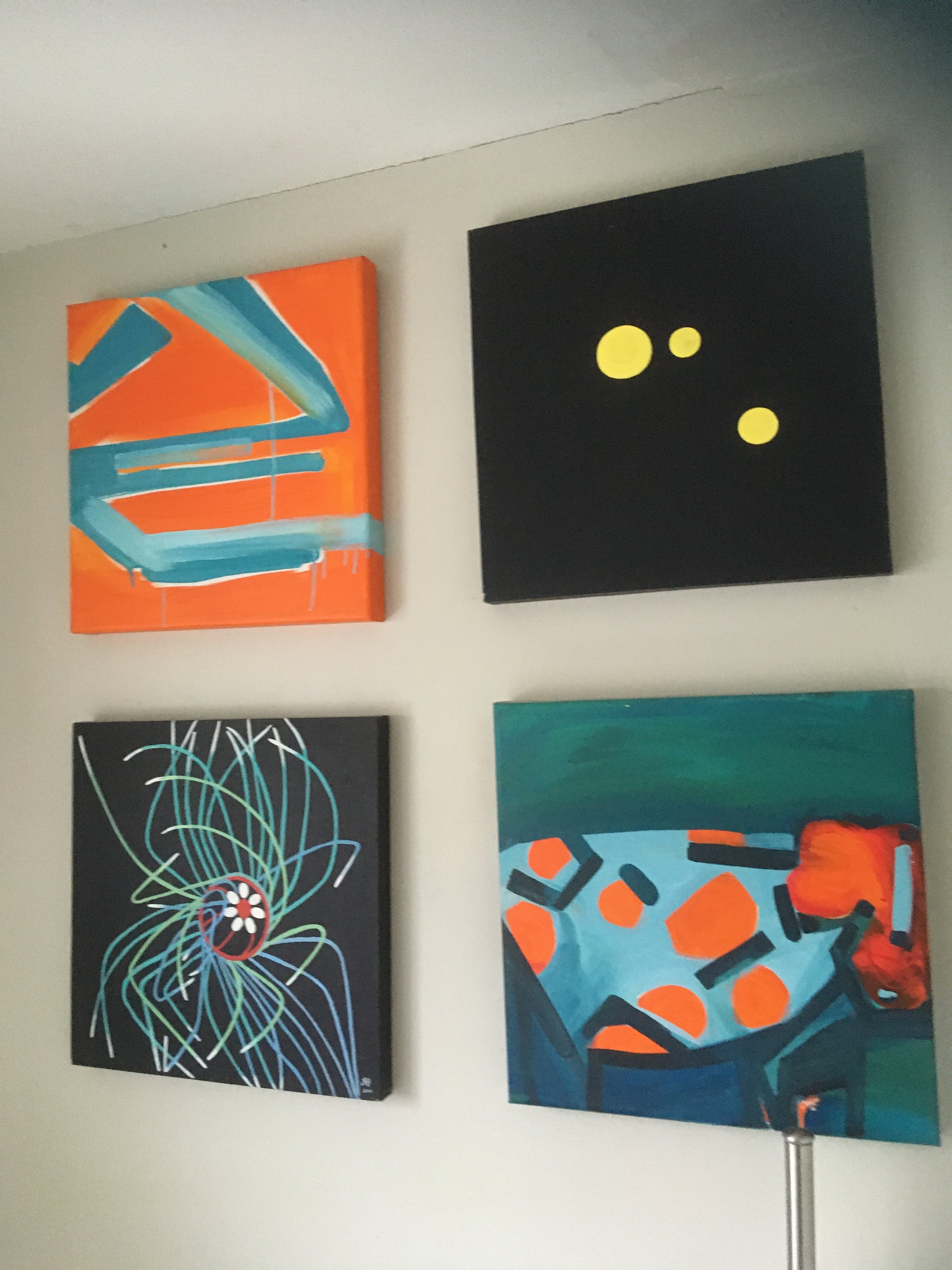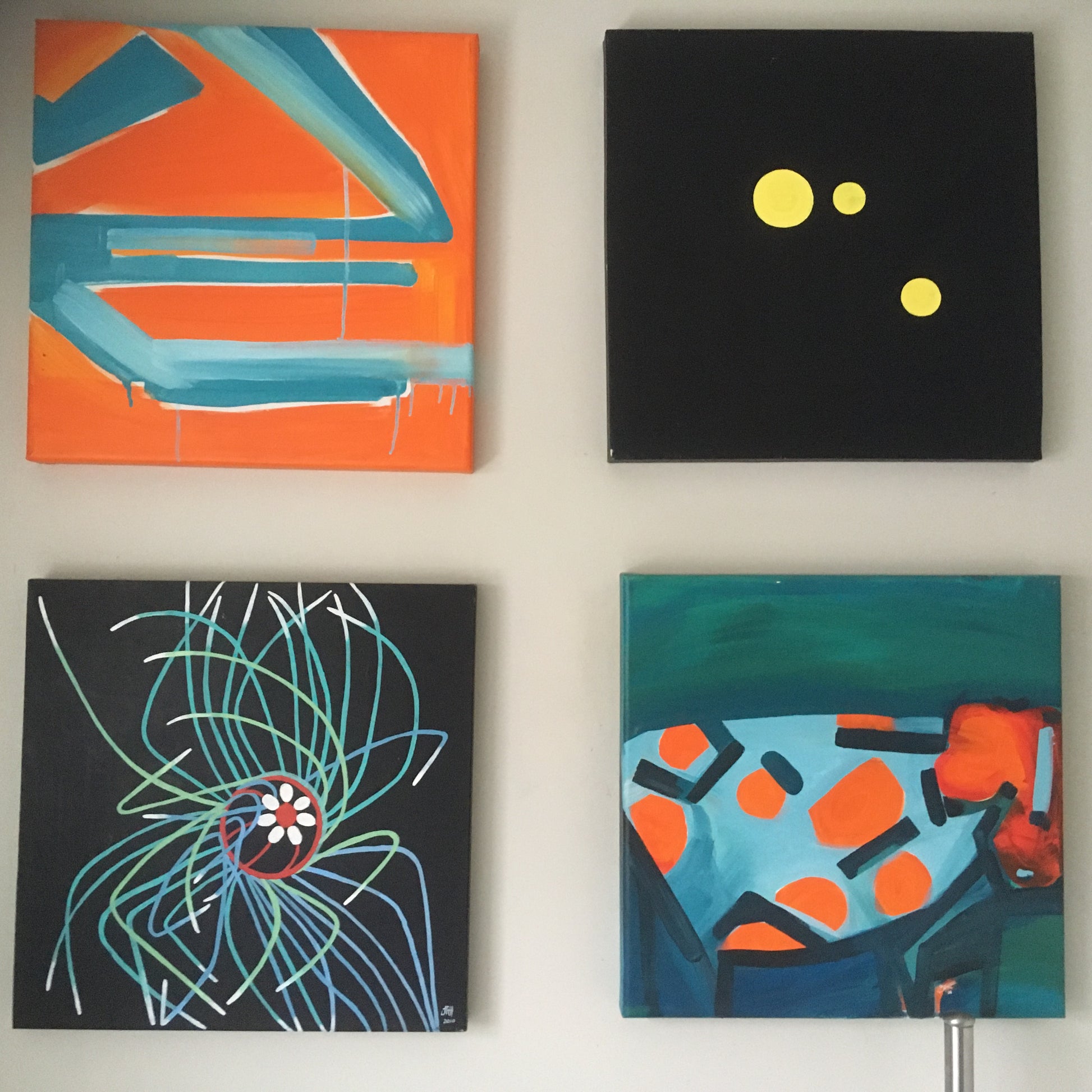 Experimental piece painted alongside the painting ‘Mad Dogs’ this artwork is titled ‘Orangey’ .The painting has a bright orange background with a layer of blue toned brush strokes, horizontal, angular, abstracted and simplistic in form. Spontaneity leaps from the canvas. Great piece of art to give a simplistic modern touch and splash of colour to brighten any space.