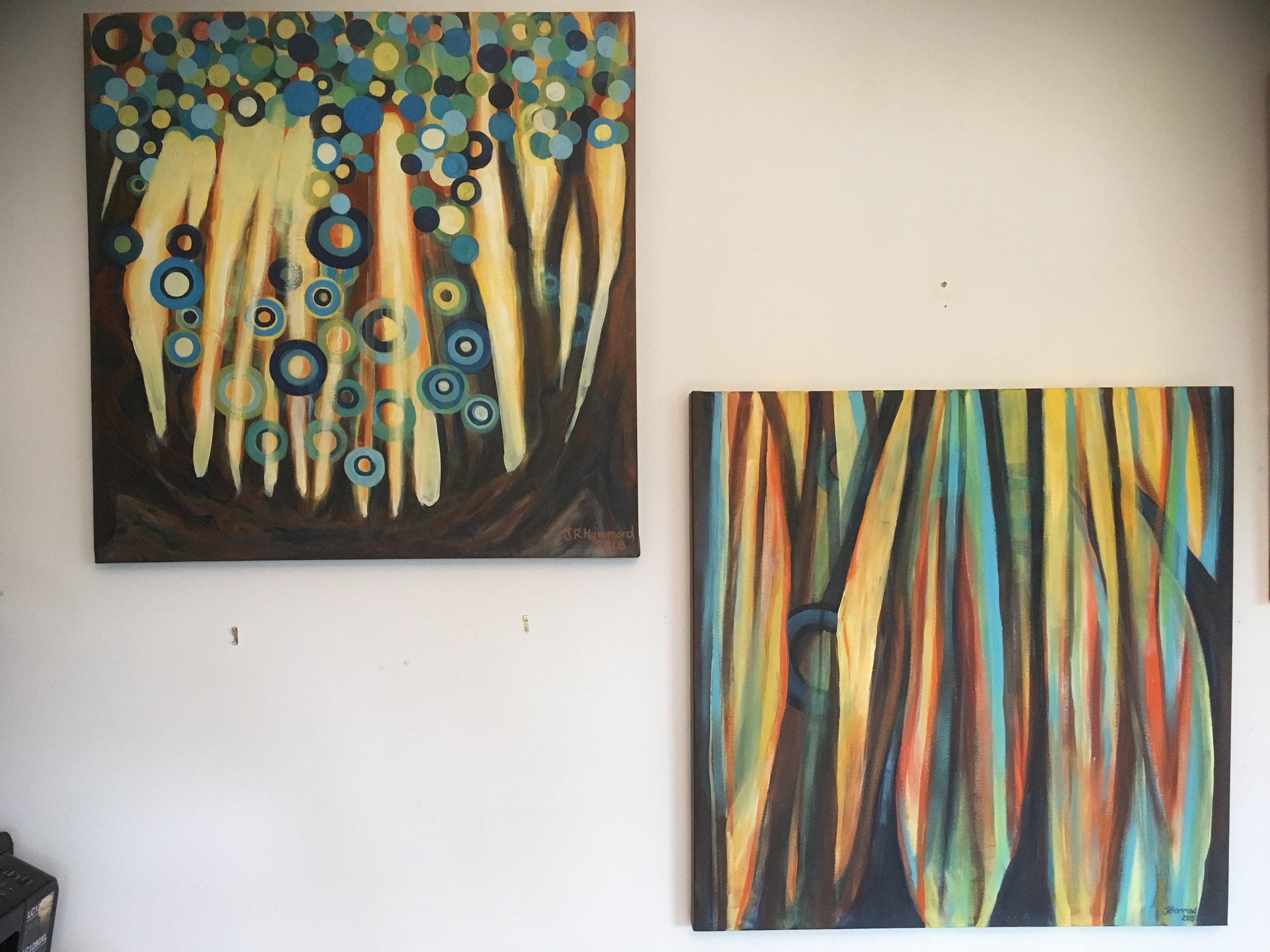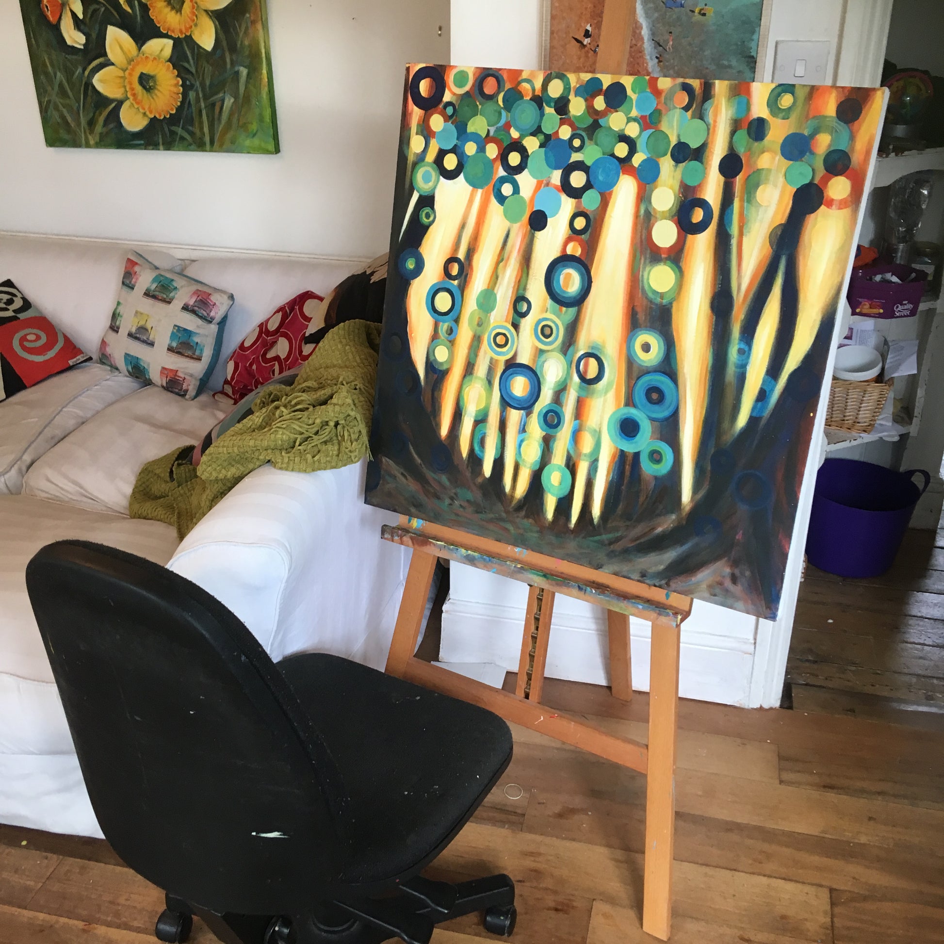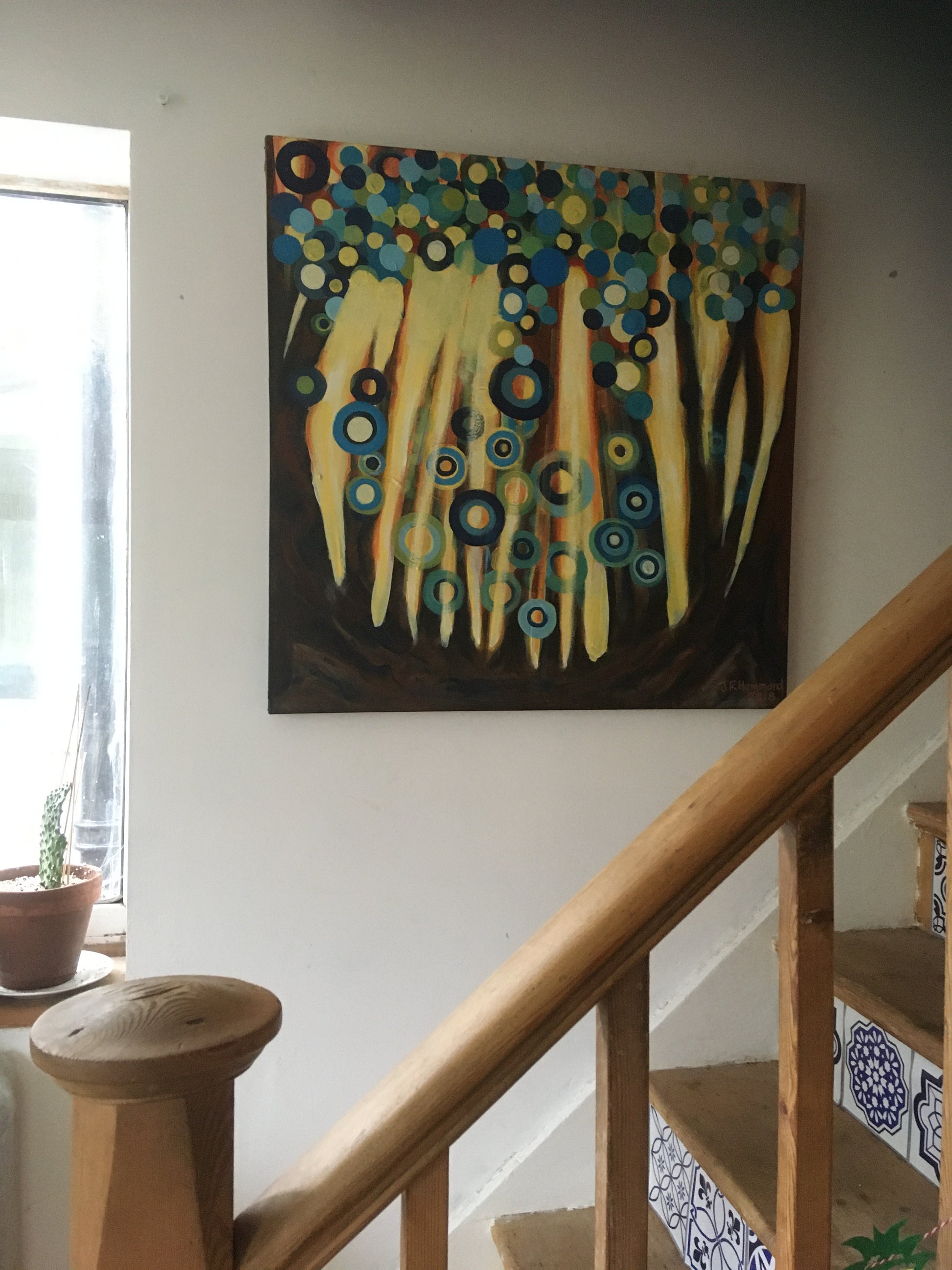Life in Circles. Acrylic painting on canvas. Abstract expressionism style piece depicting an abstracted woodland scene continuing use of circles, hoops, zeros to depict the leaves and effect of bright light bursting through as well as blurring and merging vision.