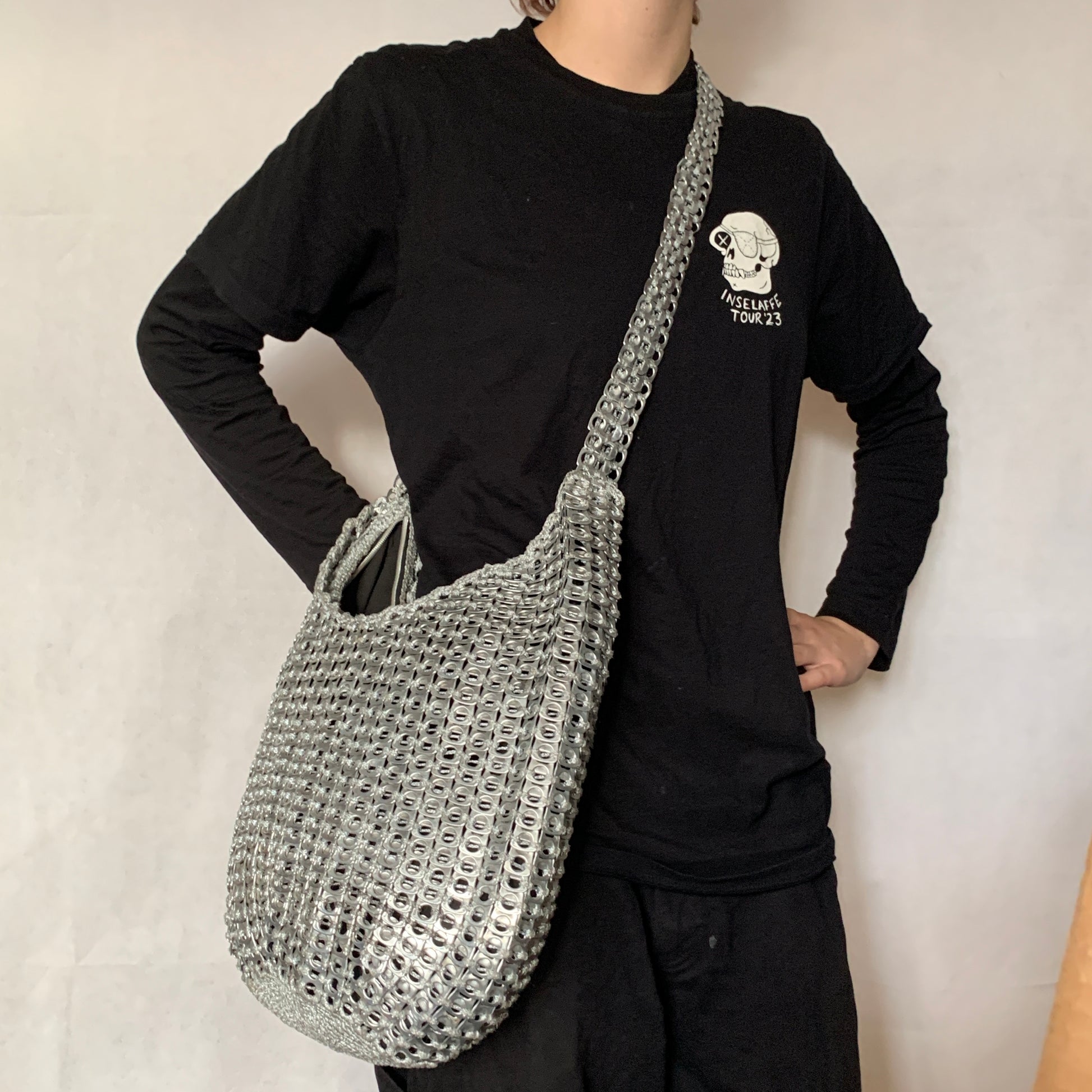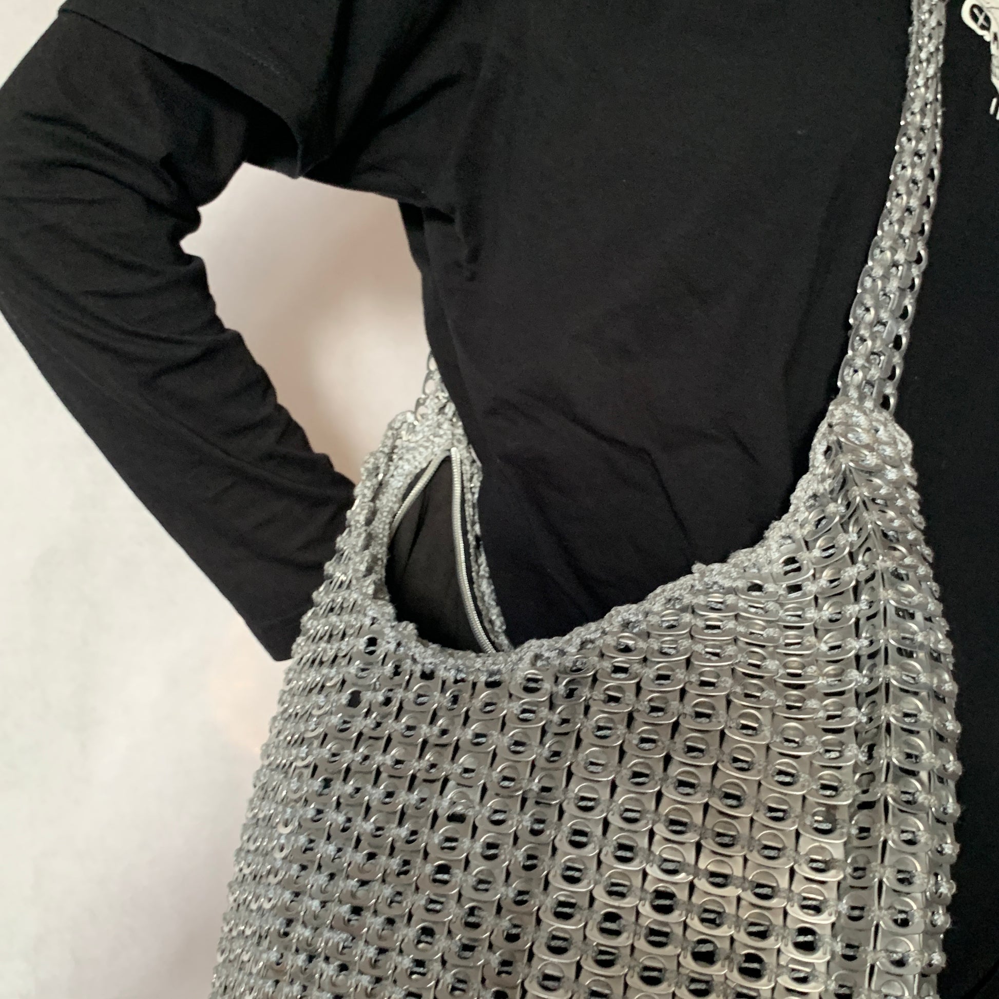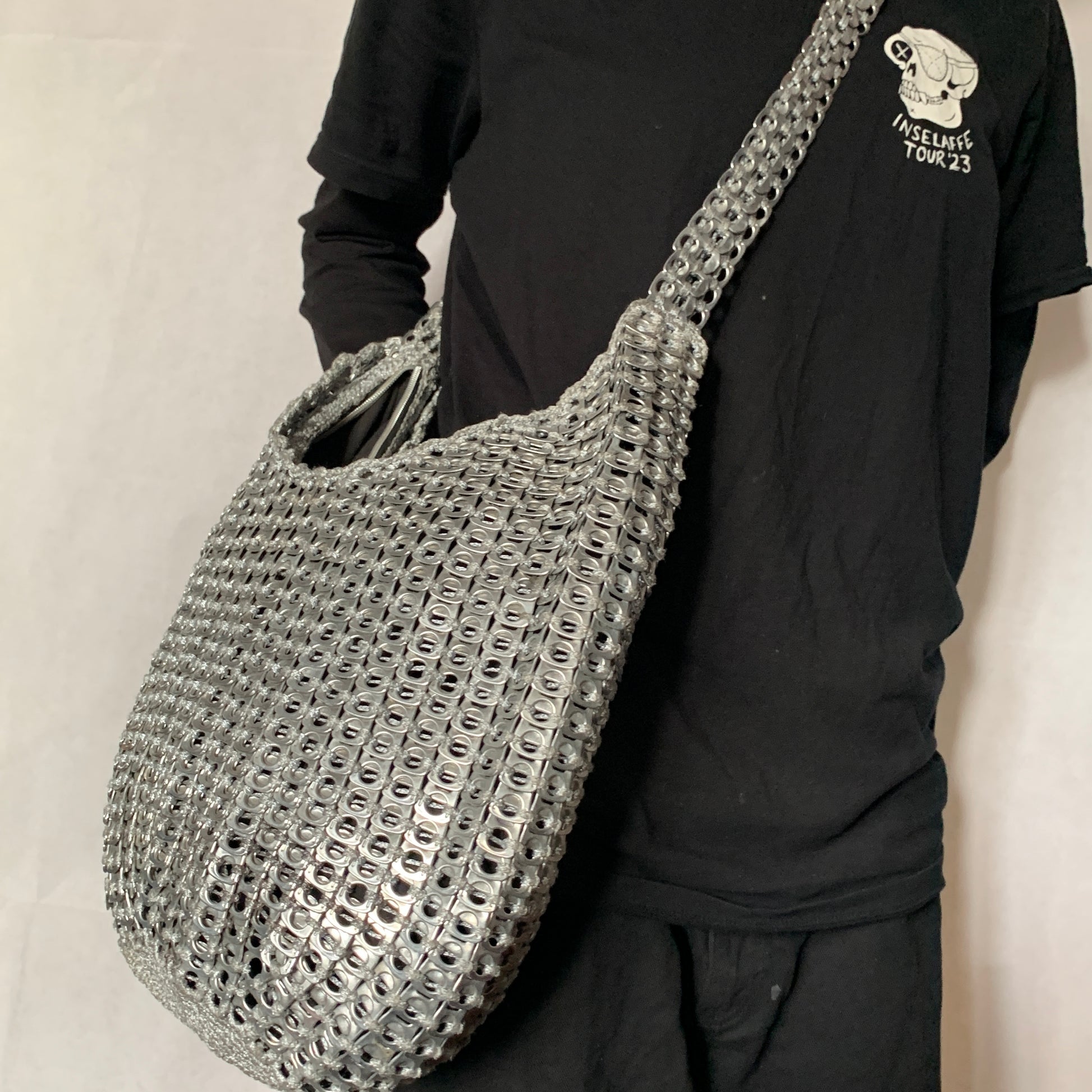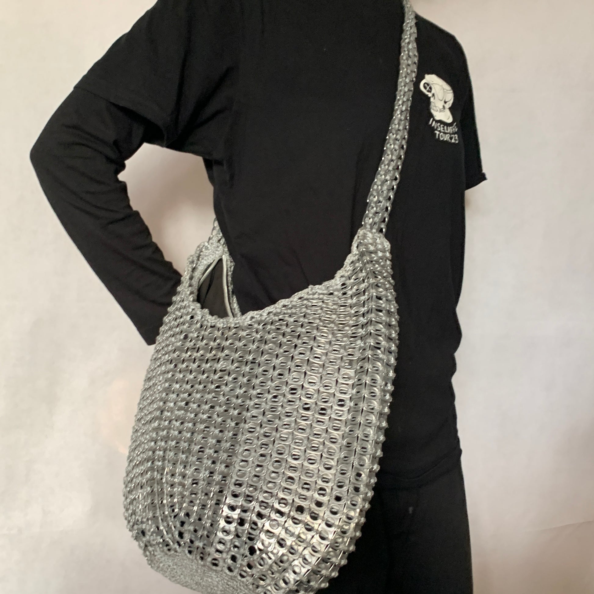 Stunning silver bag made from over seven hunderd recycled ring pulls, this is a beautiful cross-body shoulder design that you can take everywhere.