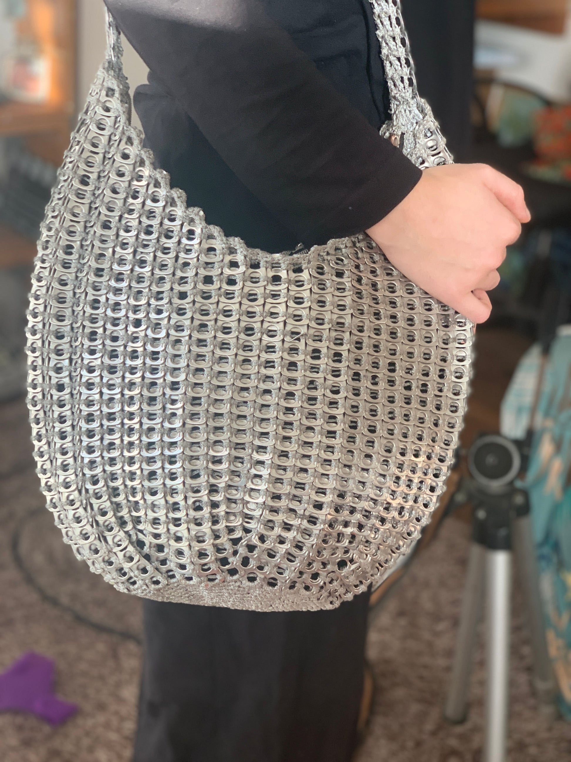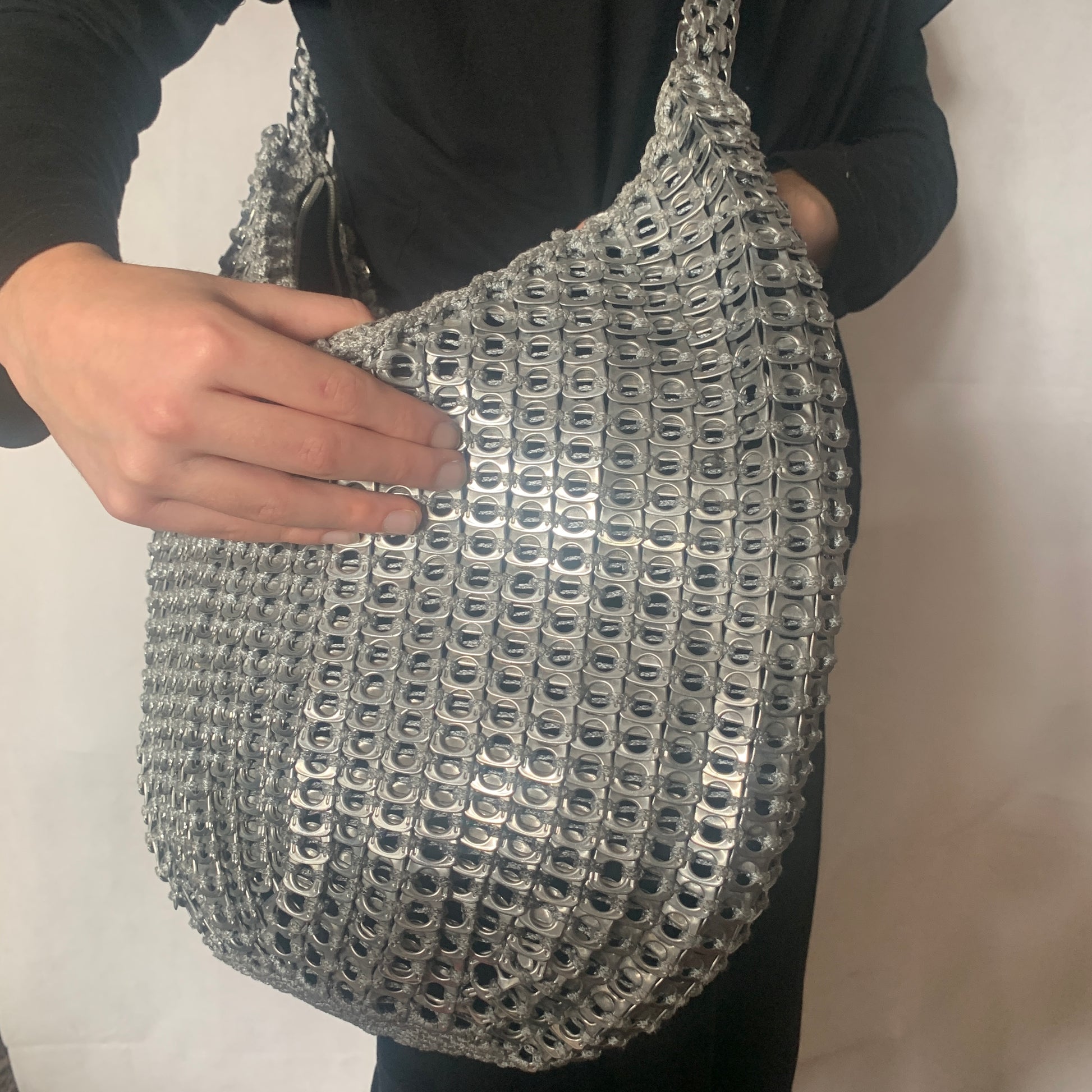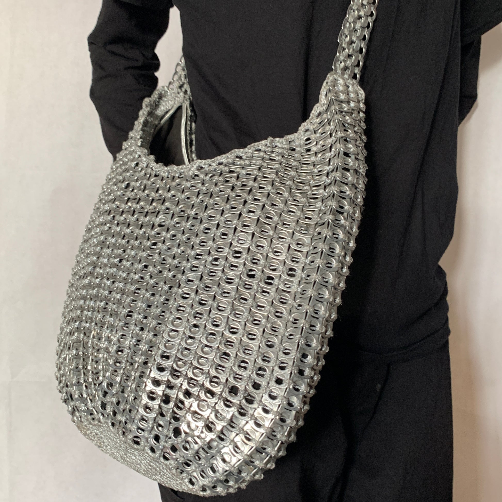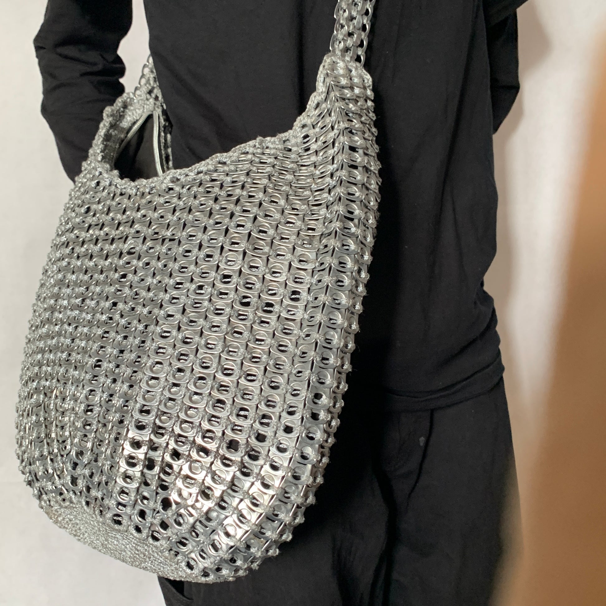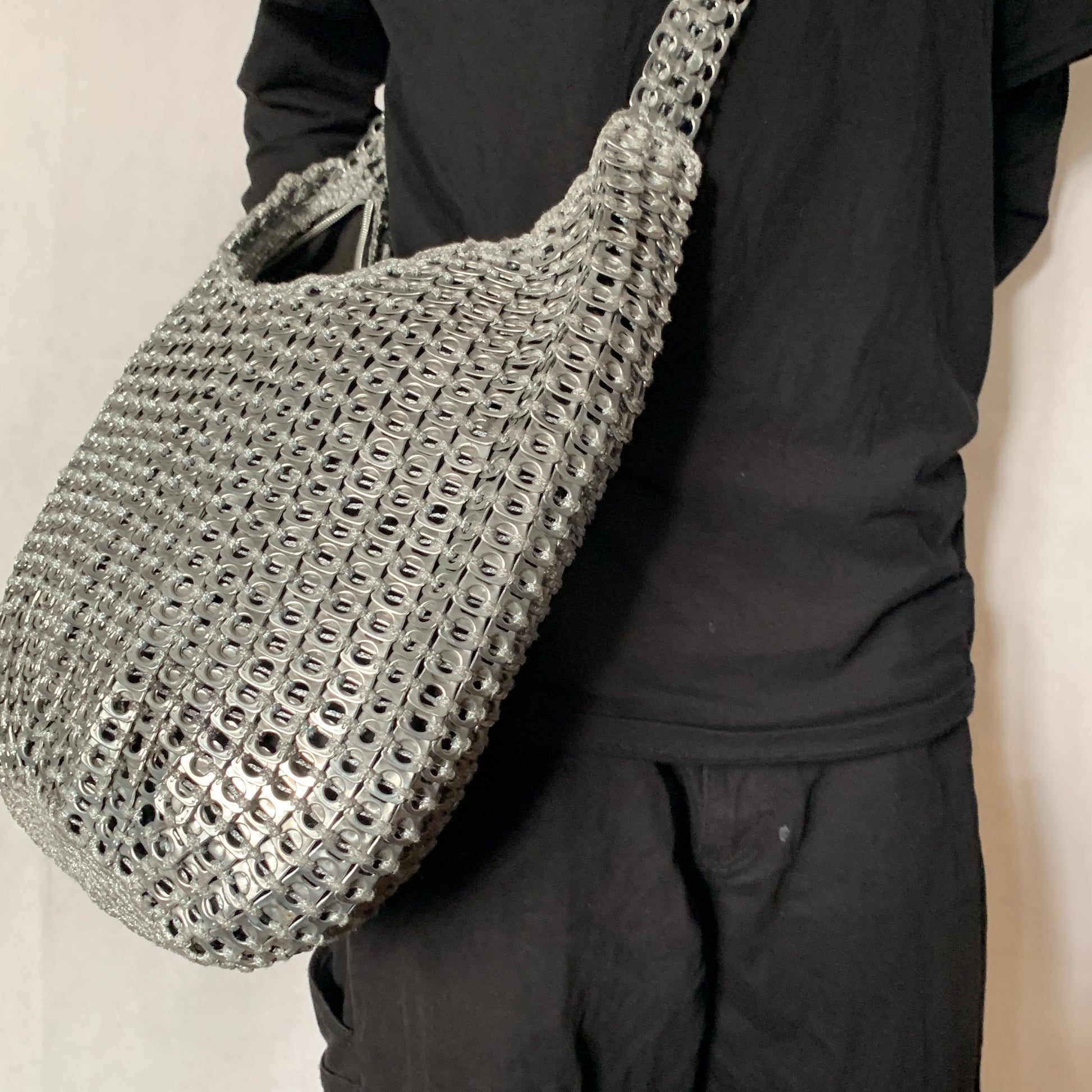 Stunning silver bag made from over seven hunderd recycled ring pulls, this is a beautiful cross-body shoulder design that you can take everywhere.