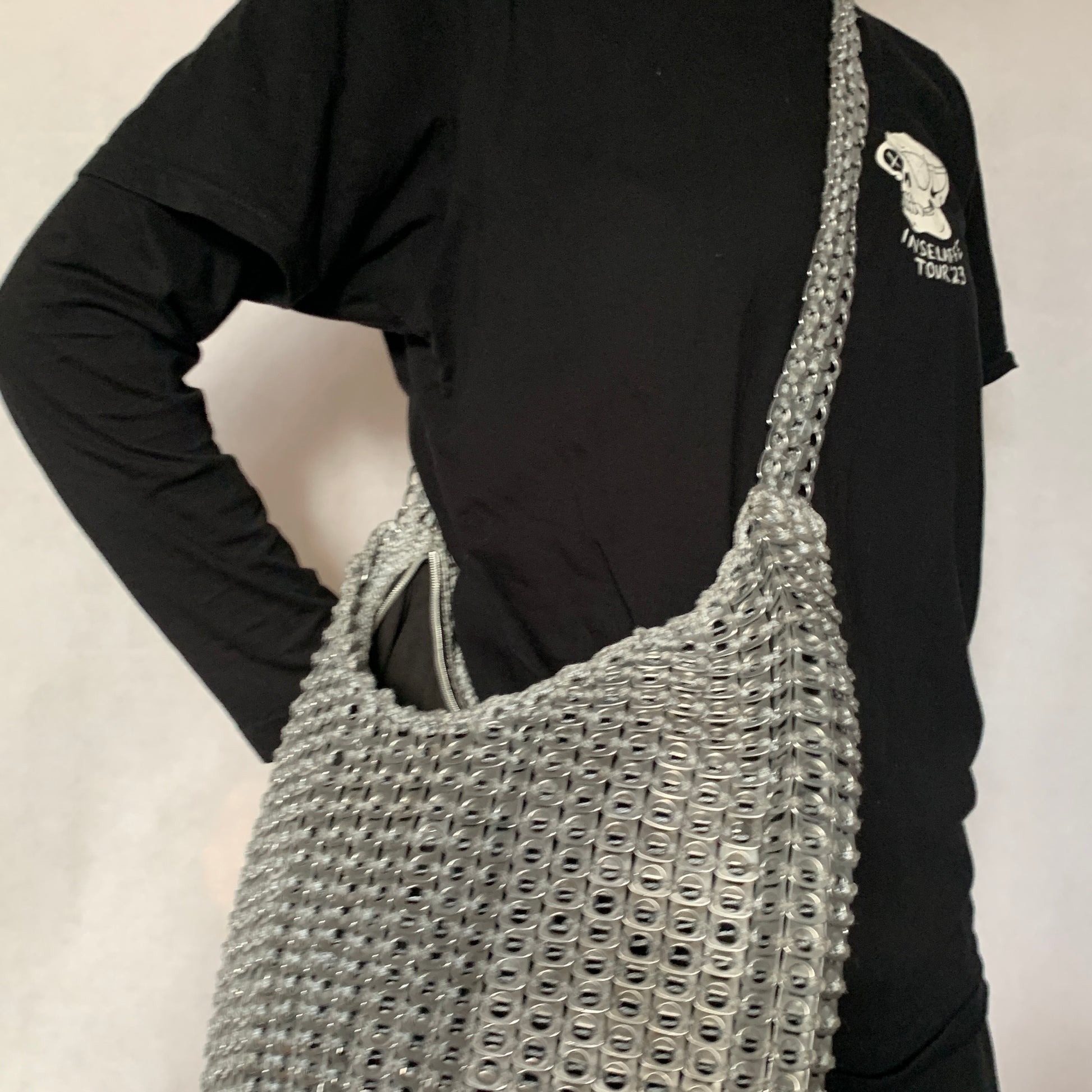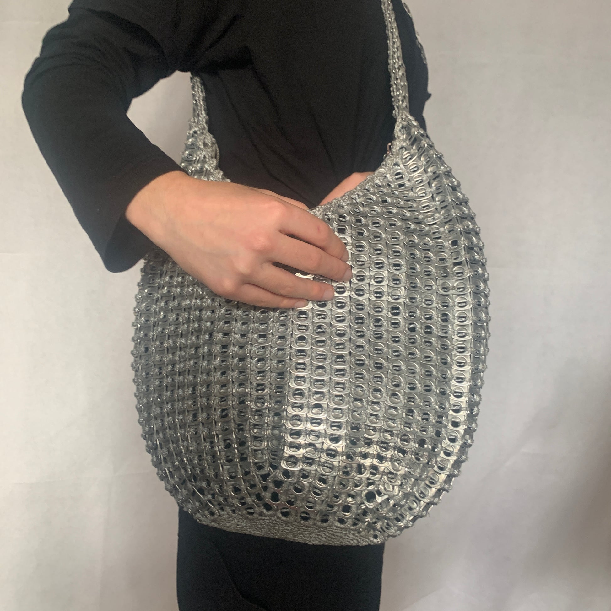 Sustainable fashion is rarely more elegant and practical than this product! With a slouchy design, our bag is crafted with beautifull hand sewn crochet and over 700 ring pulls sourced from recycling drinking cans. Fully lined and roomy, the bag features a zip compartment to keep your valuable personal items safe and secure inside.