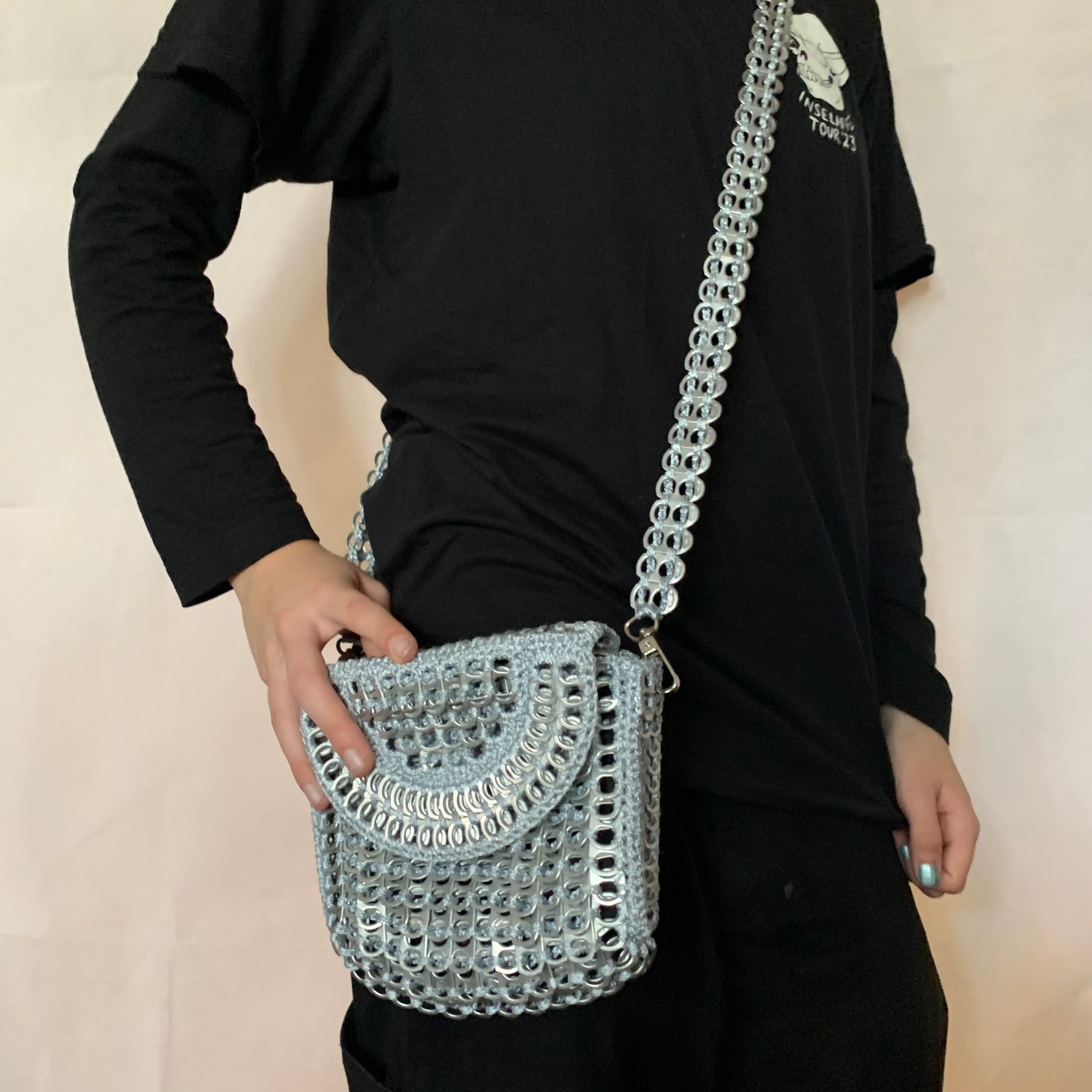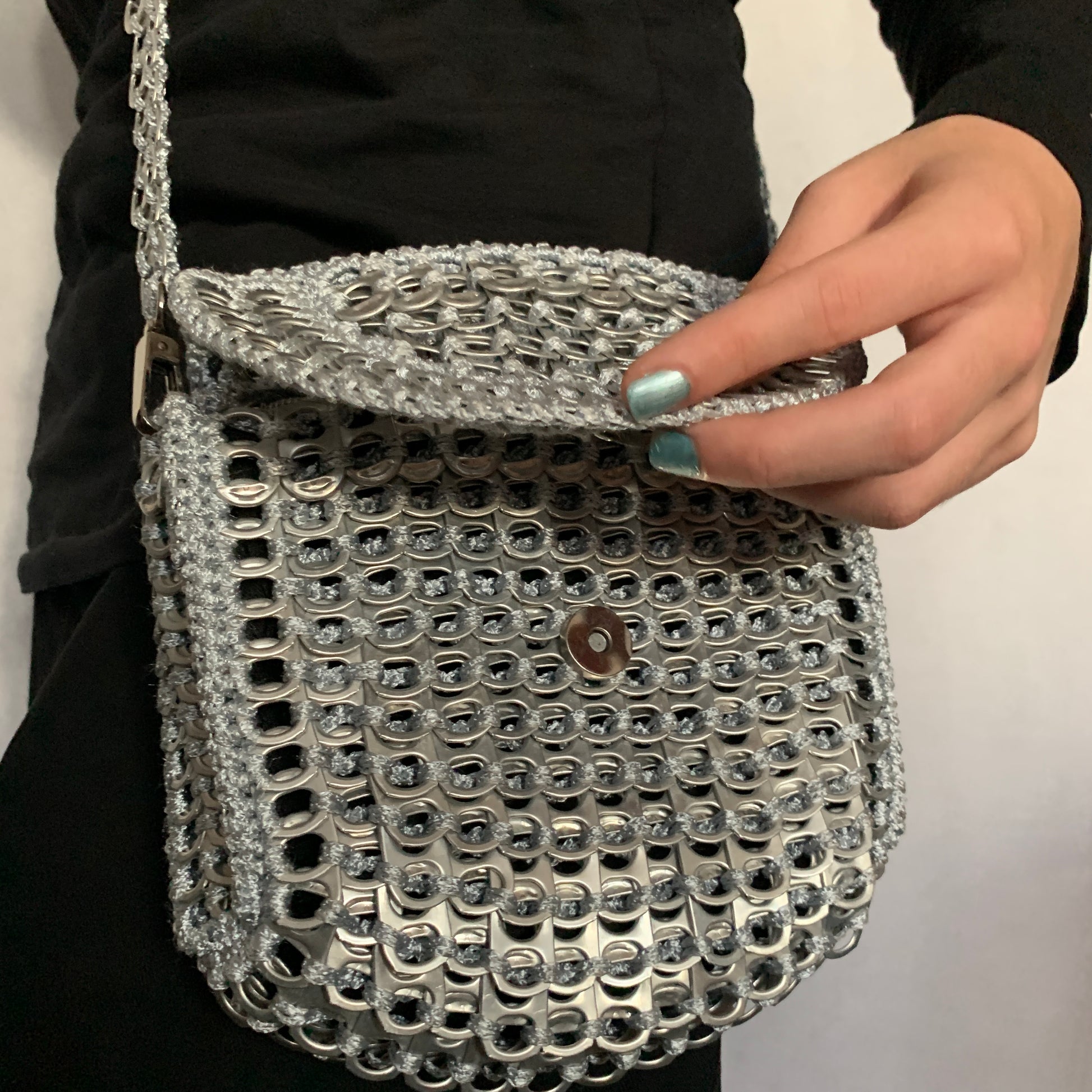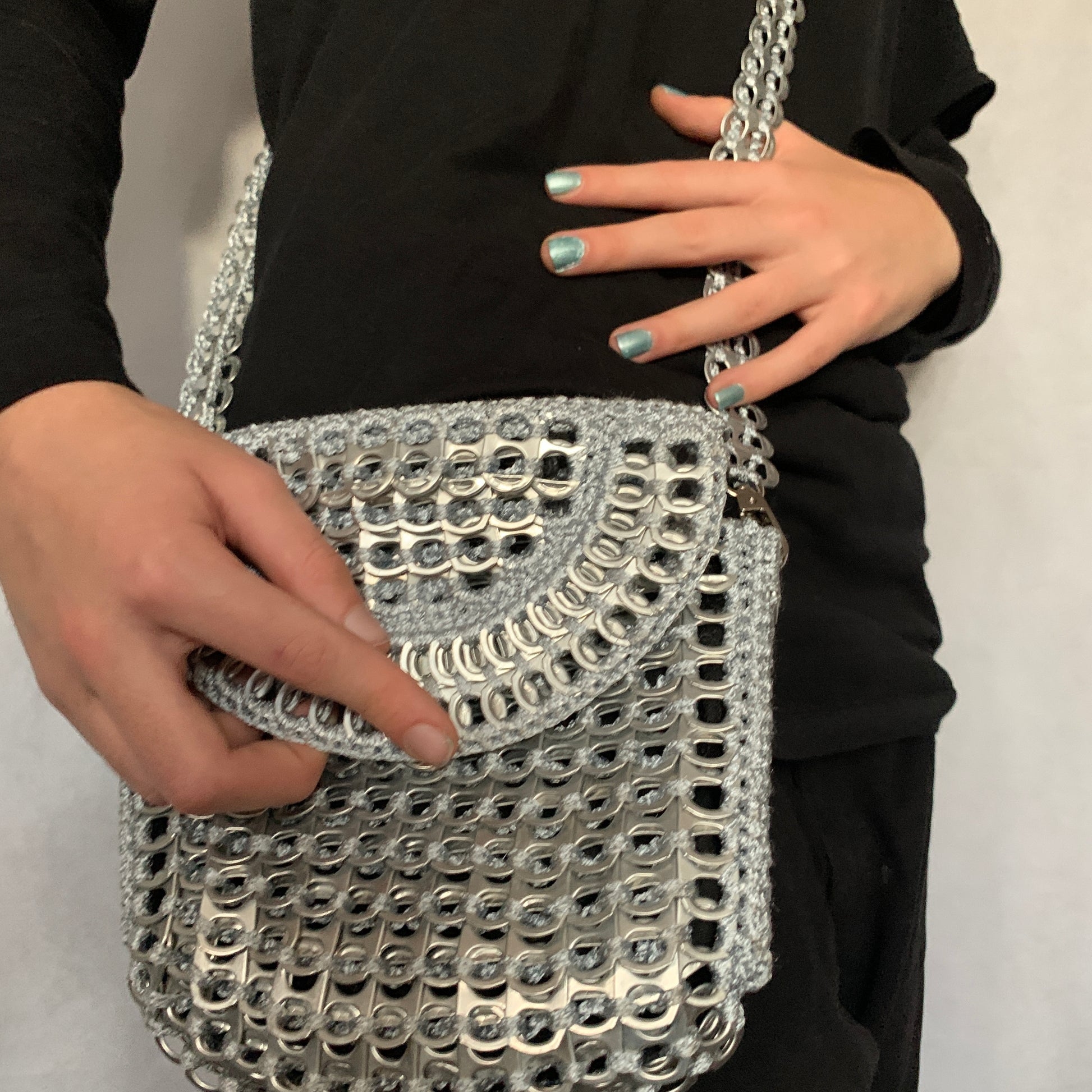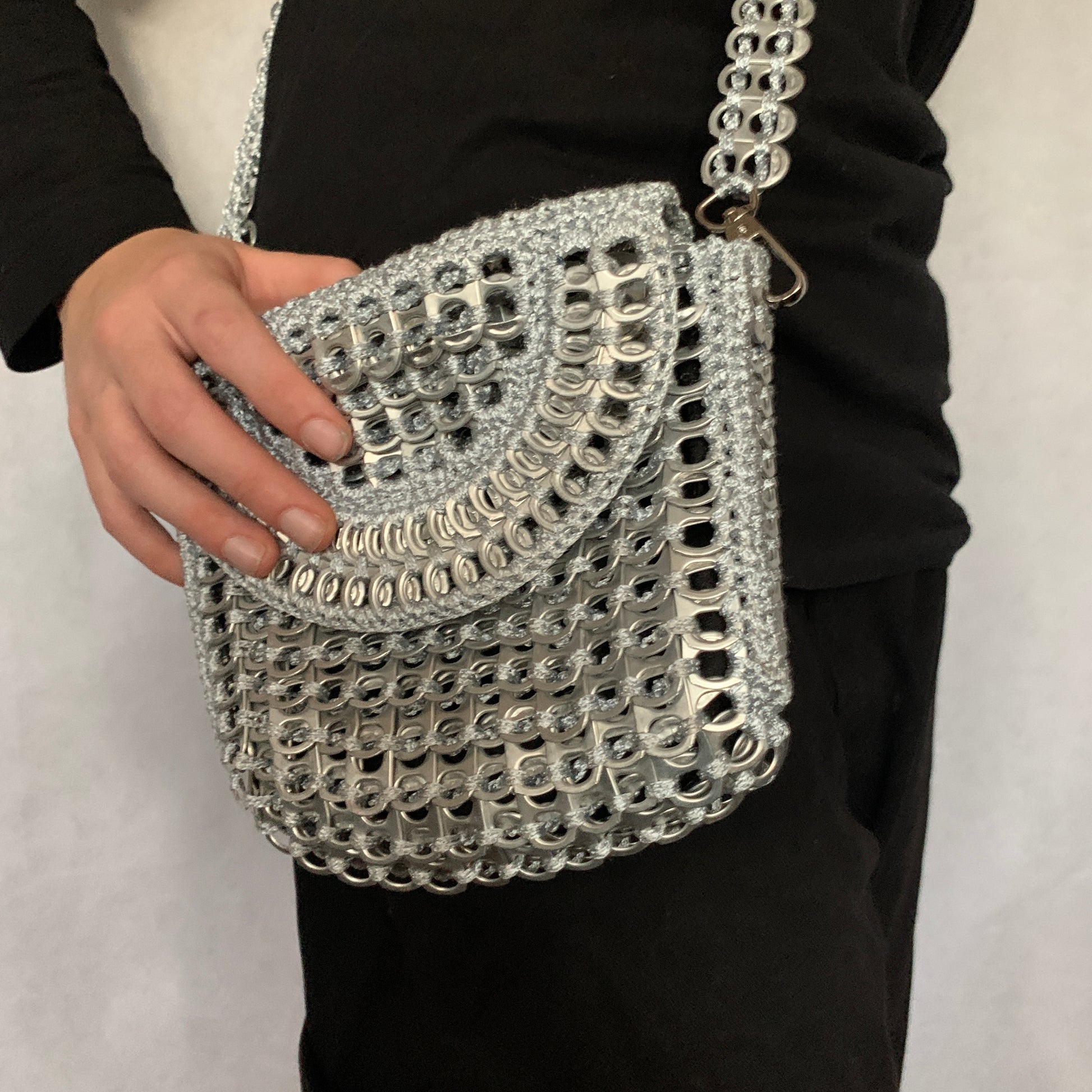 This fashionable everyday bag is made from recycled ring pulls to form a chain mail like material. The result is a super stylish silver bag that'll jazz up an outfit, day or night. Long strap that can easily be worn over the shoulder. An elegant bag hand crafted with upcycled ring pulls, fully lined with a zip compartment and popper fastened outside layer.