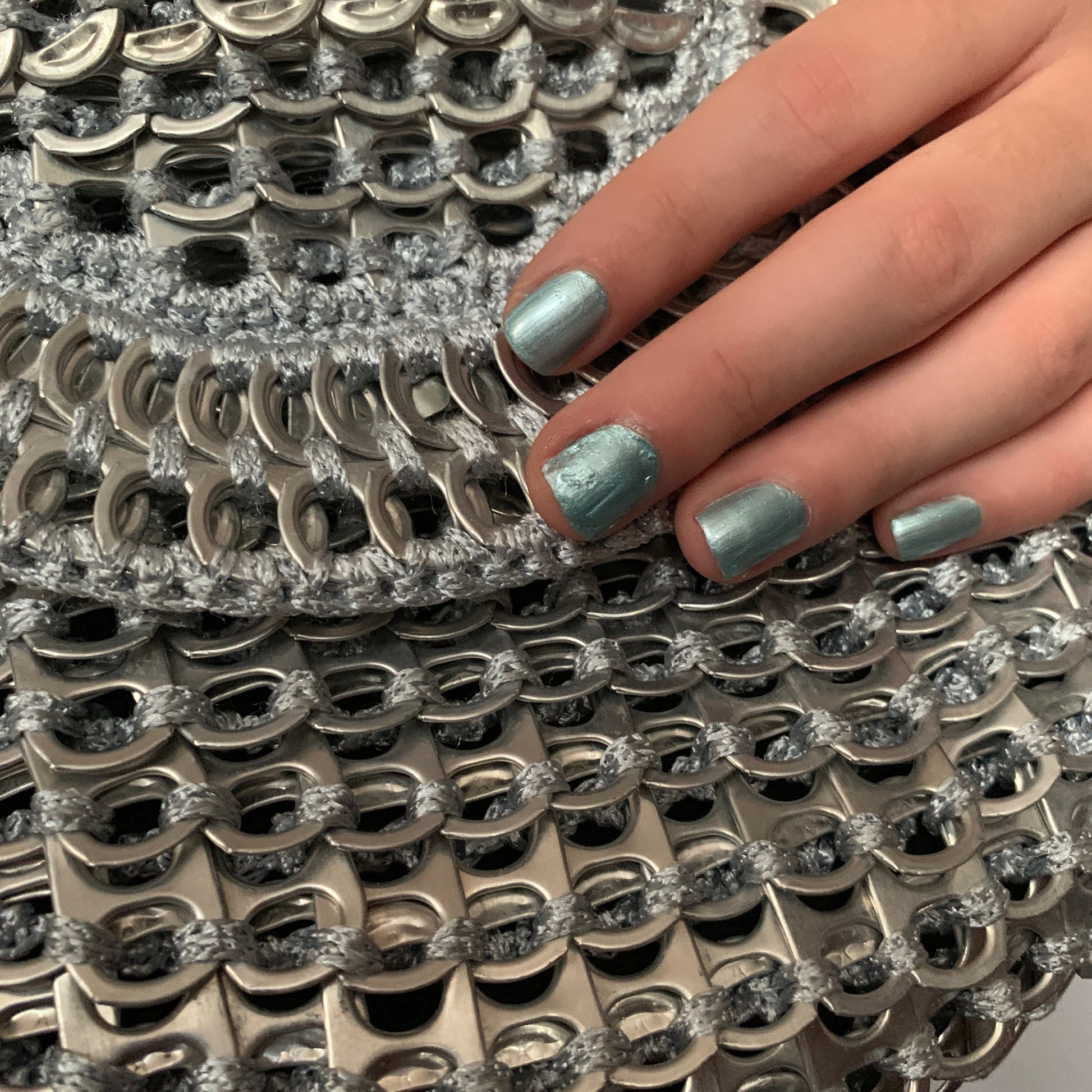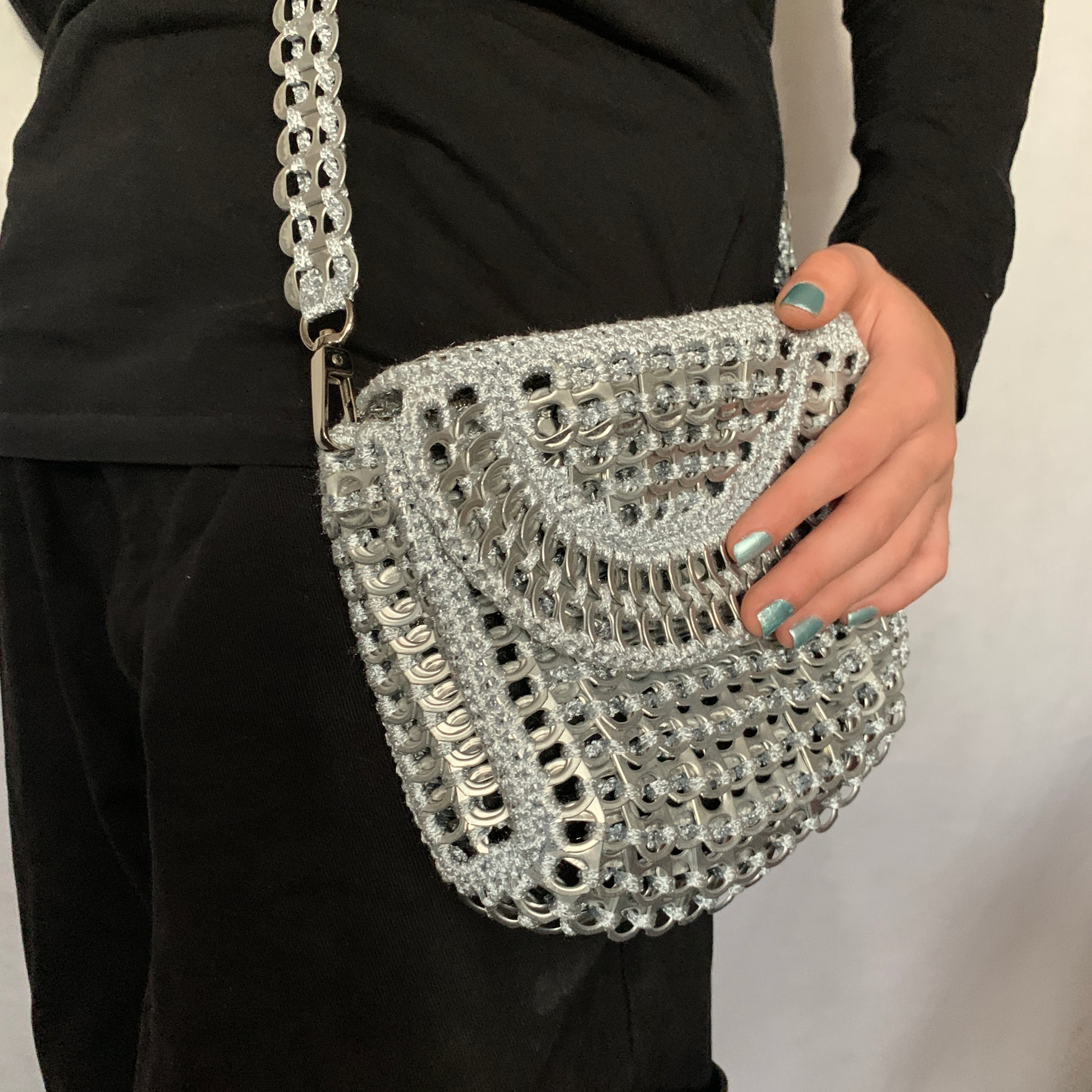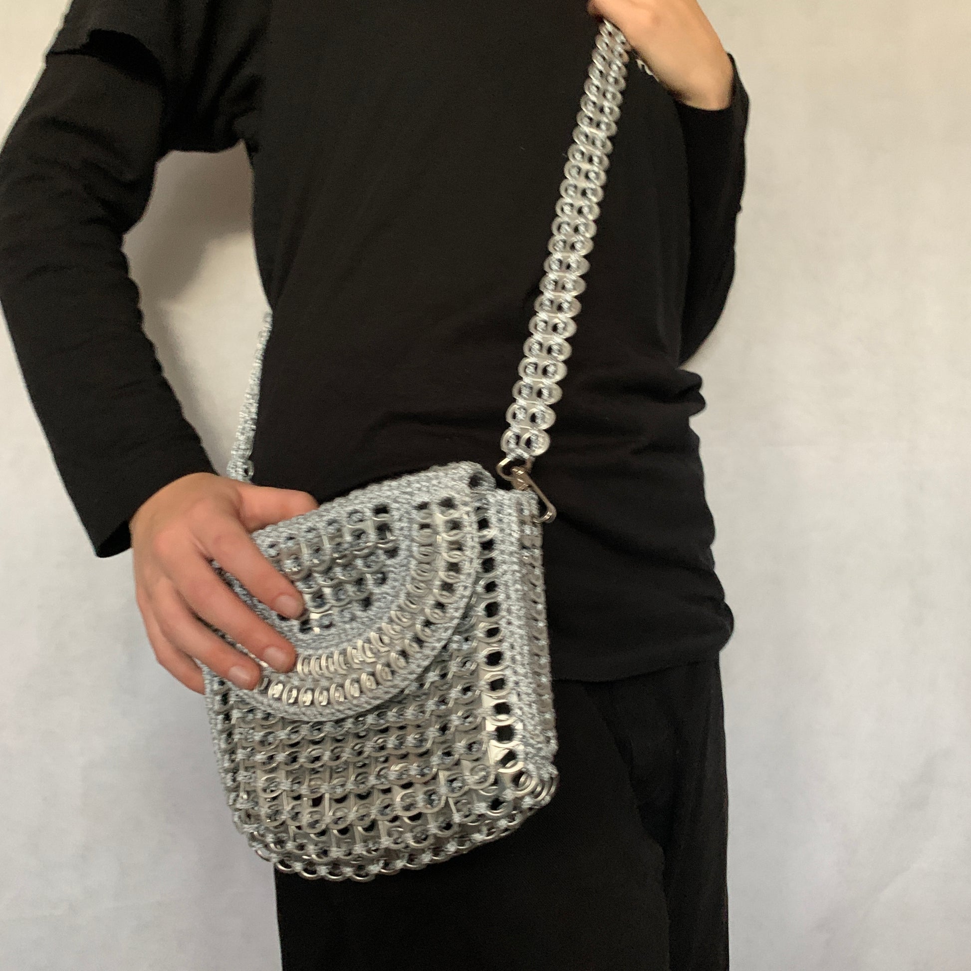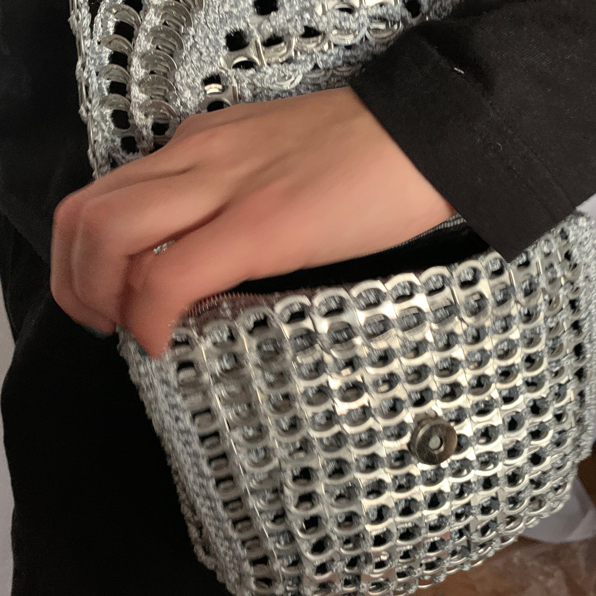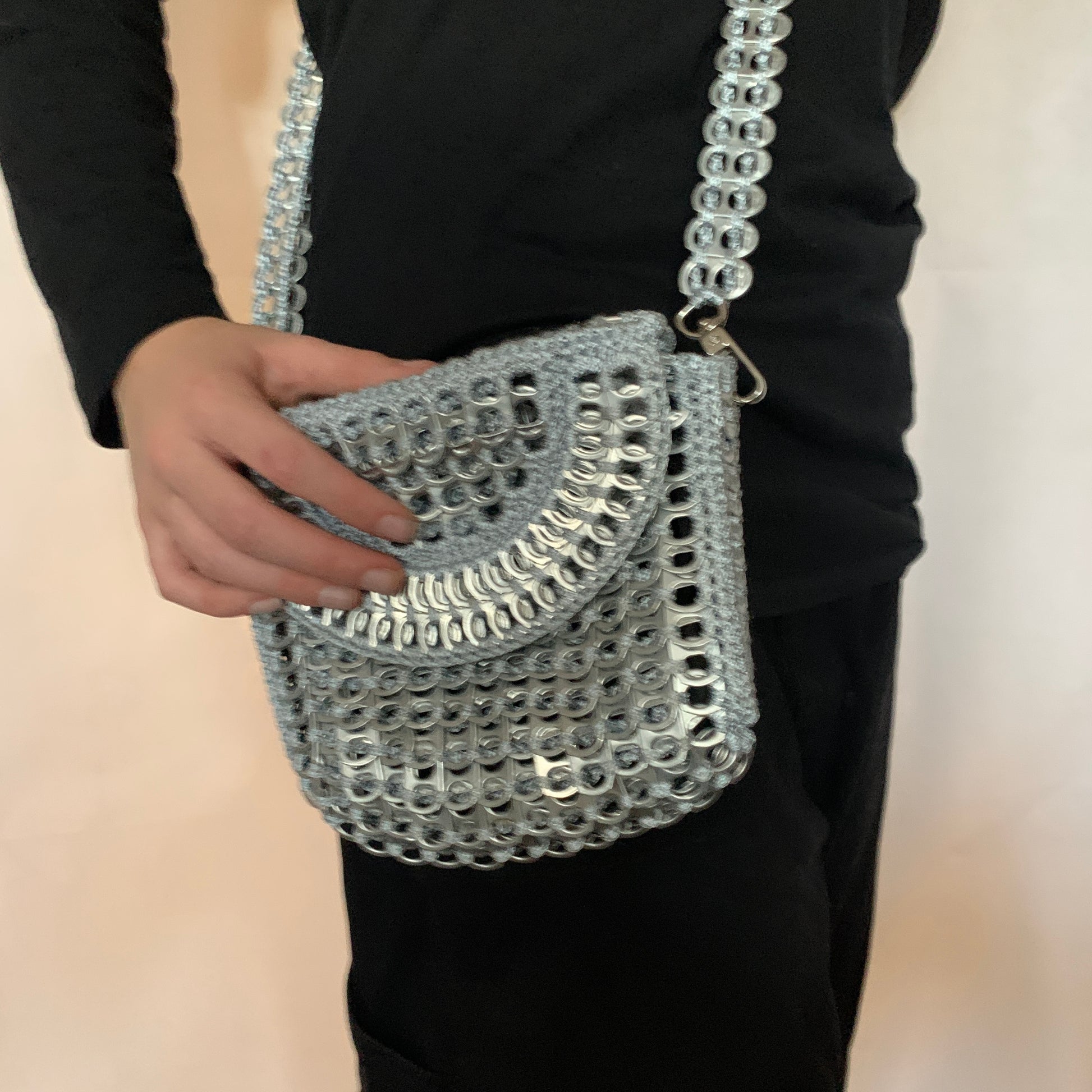 This fashionable everyday bag is made from recycled ring pulls to form a chain mail like material. The result is a super stylish silver bag that'll jazz up an outfit, day or night. Long strap that can easily be worn over the shoulder. An elegant bag hand crafted with upcycled ring pulls, fully lined with a zip compartment and popper fastened outside layer.